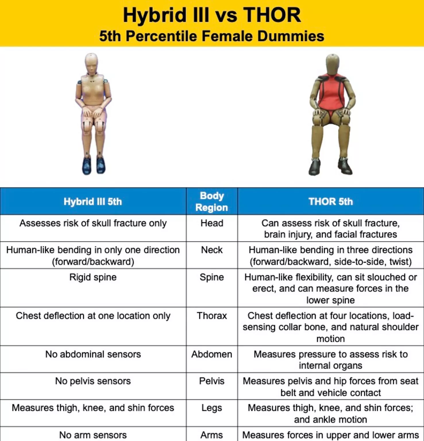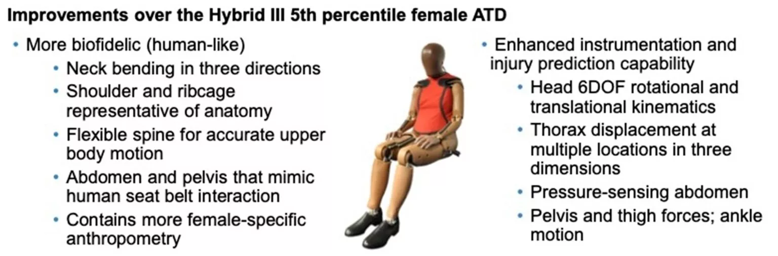 หุ่นใหม่ที่ชื่อ THOR-05F มีขนาดใกล้เคียงกับผู้หญิงที่อยู่ในกลุ่ม 5th percentile และติดตั้งเซนเซอร์ล้ำสมัยจำนวนมาก สามารถวัดการบาดเจ็บในจุดที่หุ่นแบบเดิมทำไม่ได้ ไม่ว่าจะเป็นแรงกระแทกเนื้อเยื่ออ่อน การยุบตัวของทรวงอกแบบละเอียด ไปจนถึงการเคลื่อนไหวแบบหมุนของศีรษะที่ใกล้เคียงการตอบสนองของร่างกายมนุษย์จริง