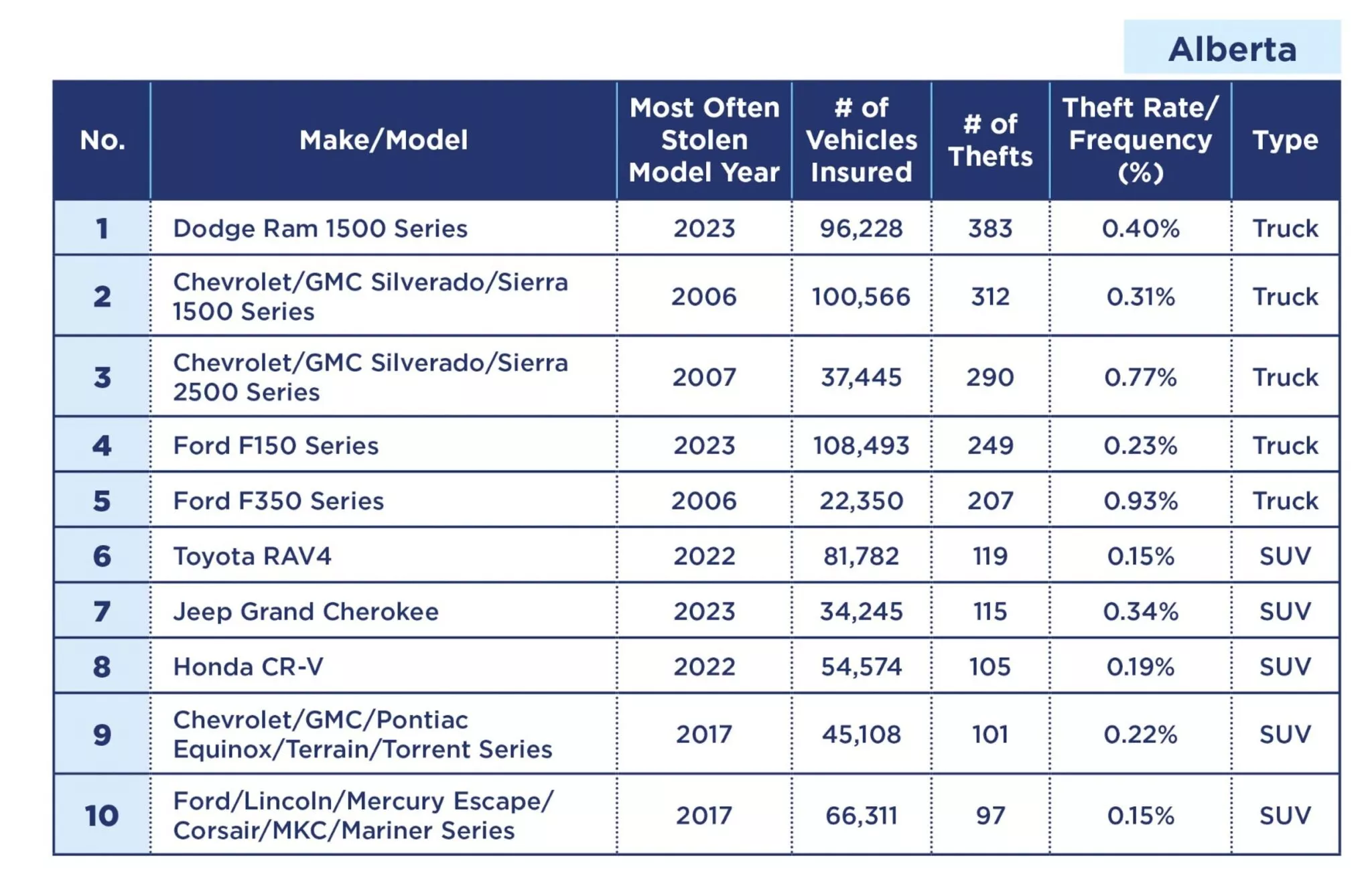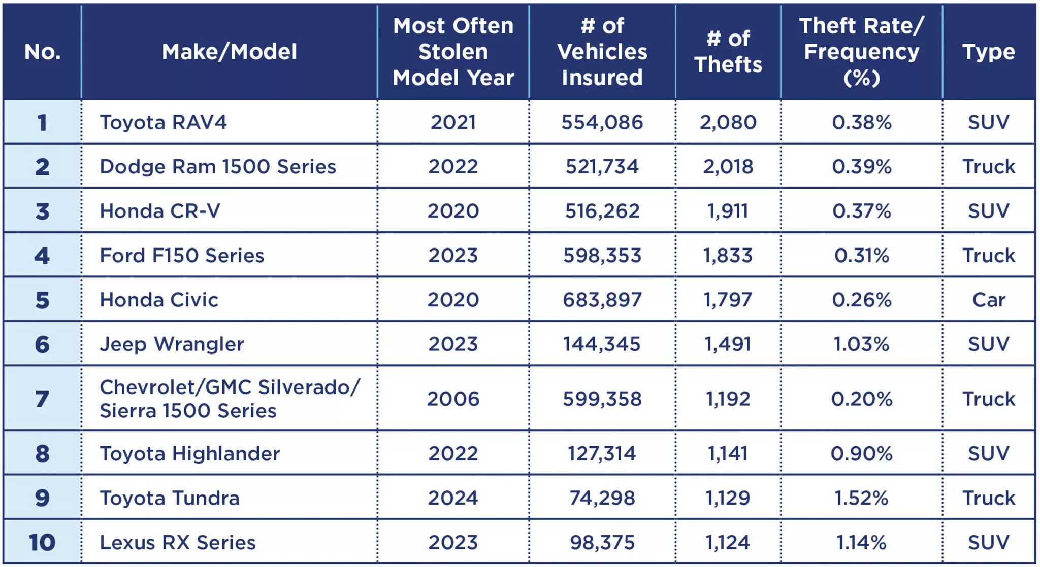หากพิจารณาจำนวนรถที่ถูกขโมยมากที่สุด Toyota RAV4 รุ่นก่อนหน้าเป็นแชมป์ประจำปีด้วยจำนวน 2,080 คัน สอดคล้องกับความนิยมสูงในตลาดแคนาดาที่มีรถรุ่นนี้อยู่แทบทุกบ้าน ทำให้เป็นเป้าหมายที่ง่ายต่อการโจรกรรม รองลงมาเป็น Ram 1500, Honda CR-V, Ford F-150 รวมถึง Jeep Wrangler, Chevrolet Silverado/GMC Sierra, Toyota Highlander, Toyota Tundra และ Lexus RX ซึ่งครองอันดับต้น ๆ ของตารางเช่นเดิม