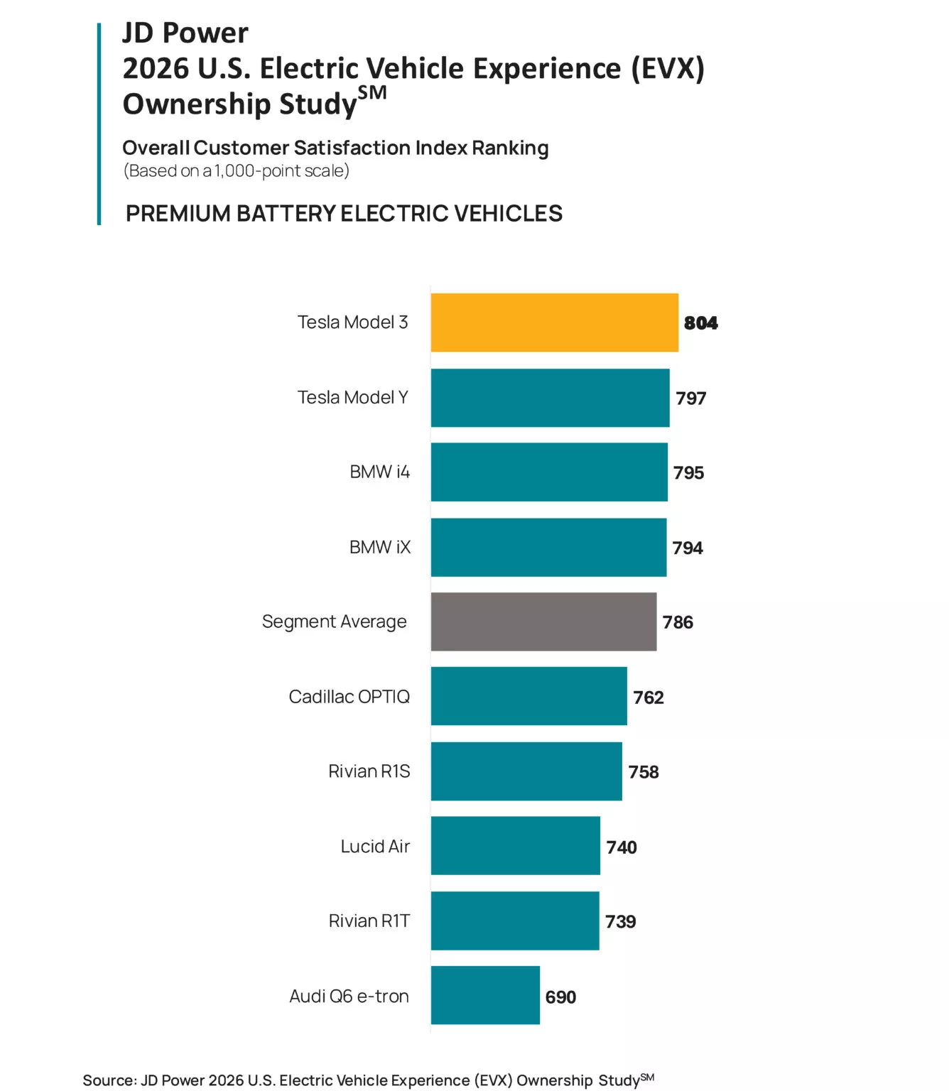ในกลุ่มรถยนต์ไฟฟ้าพรีเมียม รุ่นที่ได้คะแนนสูงสุดคือ Tesla Model 3 ที่ทำได้ 804 คะแนน ตามด้วย Tesla Model Y ที่ 797 คะแนน และ BMW i4 ที่ 795 คะแนน ตอกย้ำความแข็งแกร่งของ Tesla ในตลาด EV สหรัฐฯ อย่างไรก็ตาม BMW เริ่มไล่จี้เข้ามาใกล้มากขึ้น ขณะที่ Audi Q6 e-tron กลับทำคะแนนต่ำสุดในกลุ่มพรีเมียมที่ 690 คะแนน ต่ำกว่า Lucid Air และ Rivian R1T อย่างชัดเจน
