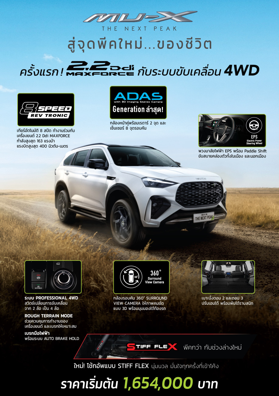 MU-X “THE NEXT PEAK” 4WD เครื่องยนต์ 2.2 Ddi MAXFORCE ในรุ่นย่อย RS และ Ultimate ในราคาเริ่มต้น 1,654,000 บาท ยกระดับสู่ตัวตนใหม่ที่เหนือกว่าในทุกด้าน ภายใต้แนวคิด “สู่จุดพีคใหม่ของชีวิต” ที่ให้สมรรถนะเร้าใจควบคู่ความประหยัดน้ำมัน ครั้งแรก! กับระบบขับเคลื่อน 4WD ในเครื่องยนต์ 2.2 Ddi MAXFORCE ที่มอบพละกำลังสูงสุด 163 แรงม้า แรงบิดสูงสุด