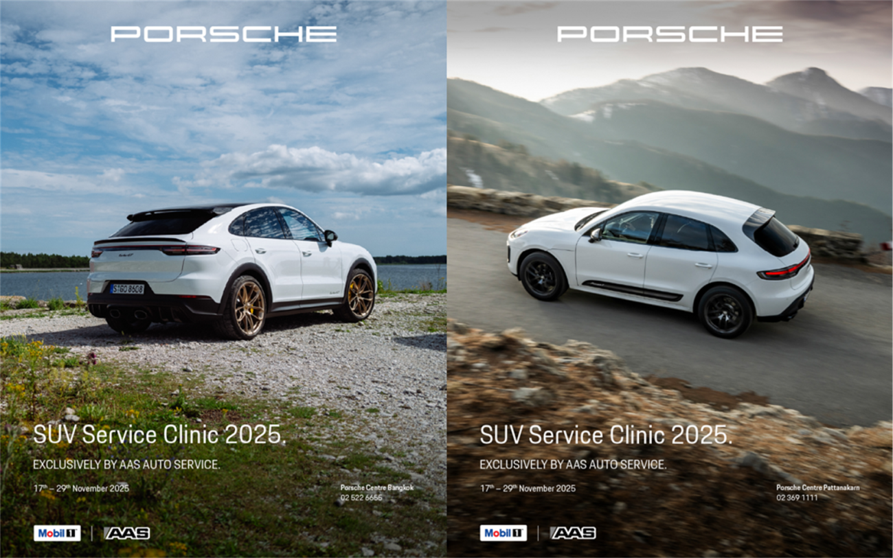 แคมเปญพิเศษ “Porsche SUV Service Clinic 2025” จัดขึ้นระหว่างวันที่ 17 – 29 พฤศจิกายน 2568 ณ Porsche Centre Bangkok และ Porsche Centre Pattanakarn โดยมุ่งเน้นการดูแลรถยนต์ปอร์เช่ในกลุ่ม SUV อย่างละเอียดครบถ้วน ภายใต้แนวคิด ‘AAS Looking After YOU and Your Car’ เพื่อมอบความอุ่นใจและความมั่นใจให้แก่สมาชิกครอบครัวเอเอเอสฯ ทุกท่านในทุกการเดินทาง