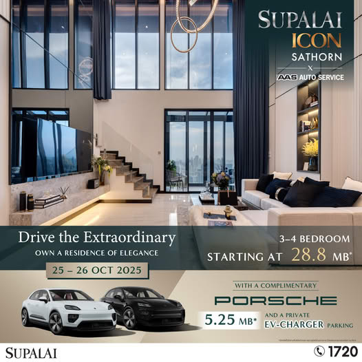 นอกจากนี้ ลูกค้ายังสามารถเป็นเจ้าของ ปอร์เช่ มาคันน์ (Macan Electric) มูลค่า 5.25 ล้านบาท พร้อมที่จอดรถส่วนตัวและเครื่องชาร์จไฟฟ้า (EV Charger) ได้ง่าย ๆ เพียงจองห้องชุดในโครงการ ศุภาลัย ไอคอน สาทร (SUPALAI ICON SATHORN) ฟรีโฮลด์คอนโดมิเนียมหรูใจกลางเมือง แบบ 3-4 ห้องนอน ราคาเริ่มต้นเพียง 28.8 ล้านบาท*