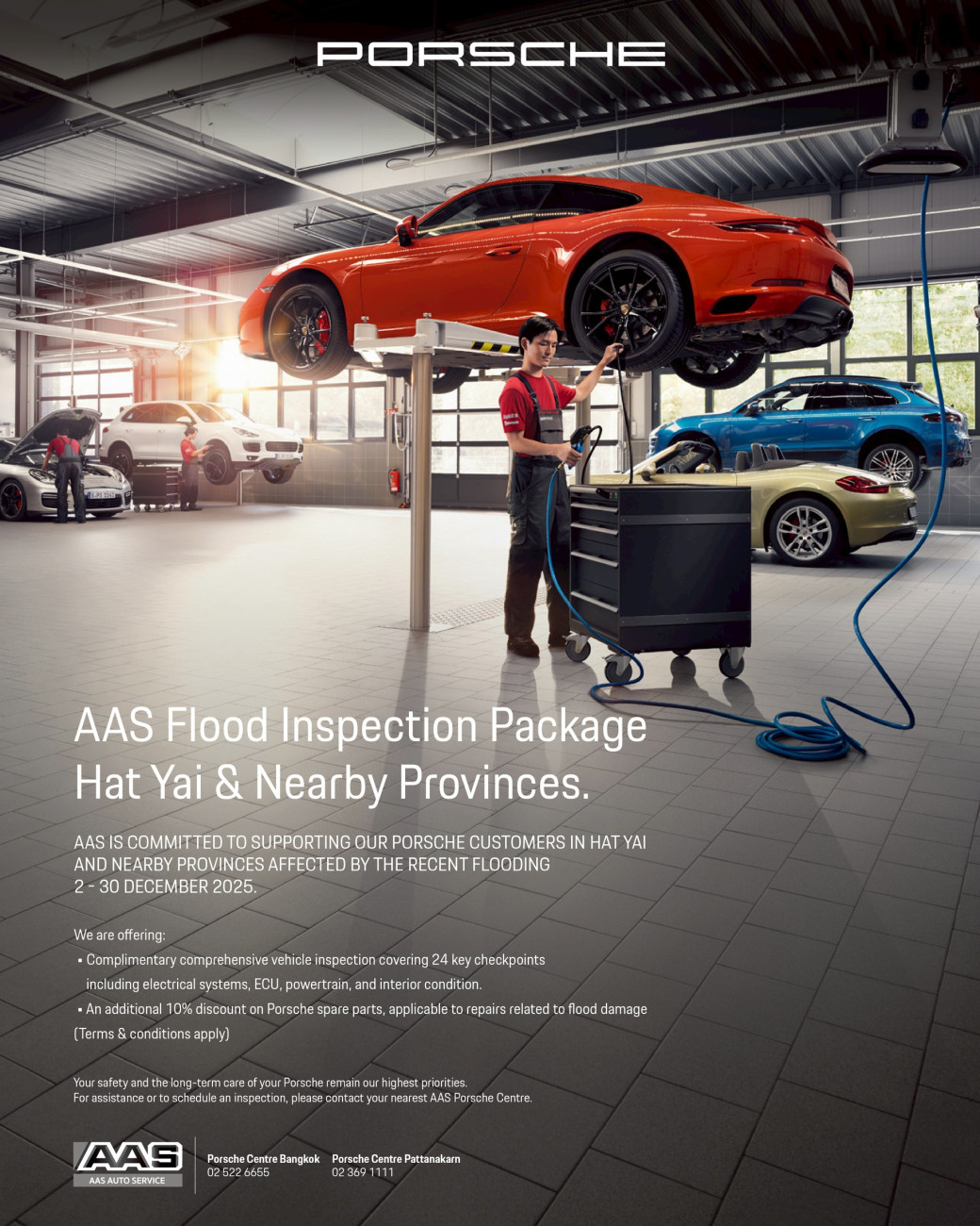 เอเอเอส ออโต้ เซอร์วิส ตัวแทนจำหน่ายรถยนต์ปอร์เช่อย่างเป็นทางการแห่งแรกในประเทศไทย และศูนย์บริการมาตรฐานจากโรงงานปอร์เช่ ประเทศเยอรมนี ตระหนักถึงผลกระทบจากสถานการณ์น้ำท่วมในอำเภอหาดใหญ่ จังหวัดสงขลา และพื้นที่จังหวัดใกล้เคียง ซึ่งอาจสร้างความเสียหายให้กับรถยนต์ปอร์เช่ของครอบครัวเอเอเอสฯ เราจึงขอร่วมเป็นส่วนหนึ่งในการดูแลความปลอดภัยและการบำรุงรักษารถยนต์ของลูกค้าทุกท่าน ด้วยบริการ “AAS Flood Inspection Package”