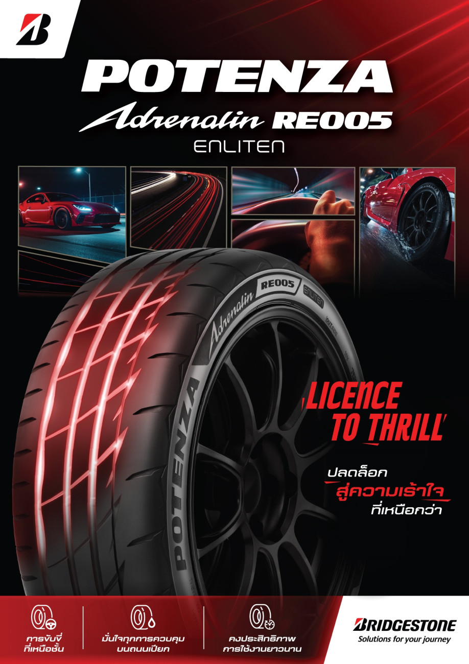 บริษัท บริดจสโตนเซลส์ (ประเทศไทย) จำกัด เปิดตัวผลิตภัณฑ์ยางรถยนต์สปอร์ตพรีเมียมรุ่นใหม่ล่าสุด “BRIDGESTONE POTENZA Adrenalin RE005” ภายใต้คอนเซปต์ “ปลดล็อกสู่ความเร้าใจที่เหนือกว่า” พร้อมให้คุณปลดปล่อยพลังความสปอร์ตเต็มพิกัด ควบคุมแม่นยำ และมั่นใจทุกการควบคุม