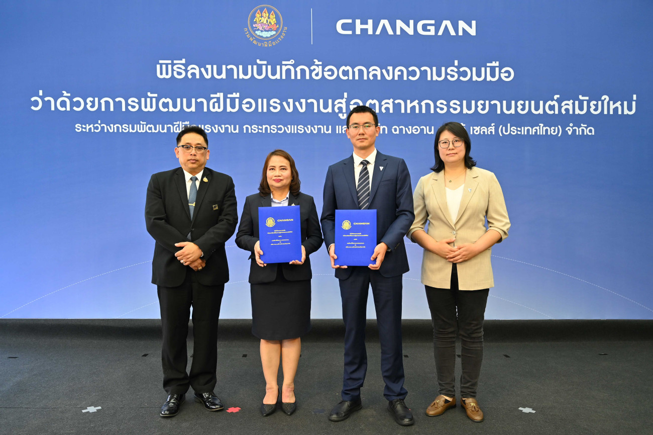 บริษัท ฉางอาน ออโต้ เซลส์ (ประเทศไทย) จำกัด ผู้นำนวัตกรรมยานยนต์พลังงานทางเลือกใหม่ภายใต้ CHANGAN Automobile กับ กรมพัฒนาฝีมือแรงงาน กระทรวงแรงงาน ร่วมลงนามบันทึกข้อตกลงความร่วมมือว่าด้วยการพัฒนาฝีมือแรงงานสู่อุตสาหกรรมยานยนต์สมัยใหม่ ระหว่าง นางจิรวรรณ สุตสุนทร รองอธิบดีกรมพัฒนาฝีมือแรงงาน ปฏิบัติราชการแทนอธิบดีกรมพัฒนาฝีมือแรงงาน และ นายอู๋ เสี่ยวคัง รองประธานบริหารฝ่ายบุคคล บริษัท ฉางอาน ออโต้ เซลส์ (ประเทศไทย) จำกัดโดยมีนางสาวเกา หยิง รองประธานบริหารฝ่ายปฏิบัติการบริการ บริษัท ฉางอาน ออโต้ เซลส์ (ประเทศไทย) จำกัด และนายเจษฎา จันทร์อุไร ผู้ตรวจราชการกรมพัฒนาฝีมือแรงงาน ร่วมลงนามเป็นสักขีพยาน พร้อมมอบวุฒิบัตรแก่ผู้ผ่านการฝึกอบรมหลักสูตรการซ่อมบำรุงรถยนต์ไฟฟ้าตามมาตรฐานศูนย์บริการยานยนต์ จำนวน 16 คน ณ ศูนย์สนับสนุนทางเทคนิคหลังการขาย CHANGAN ประจำภูมิภาคเอเชียตะวันออกเฉียงใต้ ถนนกิ่งแก้ว ตำบลราชาเทวะ อำเภอบางพลี สมุทรปราการ