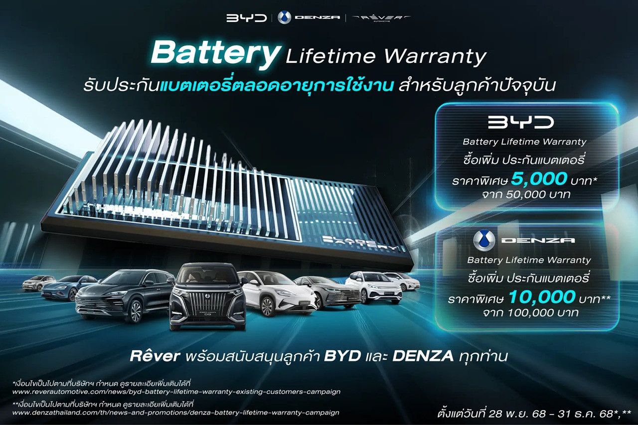 ช่วงเวลานี้จึงเป็นโอกาสสุดท้ายที่คุณไม่ควรพลาด เพราะนอกจากจะได้ครอบครองรถยนต์ บีวายดี และ เดนซ่า ในราคาที่ดีที่สุดแล้ว ยังมีข้อเสนอแพ็คเกจการรับประกันแบตเตอรี่ ตลอดอายุการใช้งาน ในราคาพิเศษสุดเพียง 5,000 บาท1 (มูลค่า 50,000 บาท) สำหรับรถยนต์ บีวายดี และ 10,000 บาท1 (มูลค่า 100,000 บาท) สำหรับรถยนต์ เดนซ่า มั่นใจตลอดอายุการใช้งาน เพราะแพคเกจครอบคลุมทั้งแบตเตอรี่แรงดันสูง (High Voltage Battery), มอเตอร์ขับเคลื่อน (Drive Motor) และ ชุดควบคุมมอเตอร์ขับเคลื่อน (PDC) ราคาพิเศษนี้มีผลถึง 31 ธันวาคม 2568 เท่านั้น