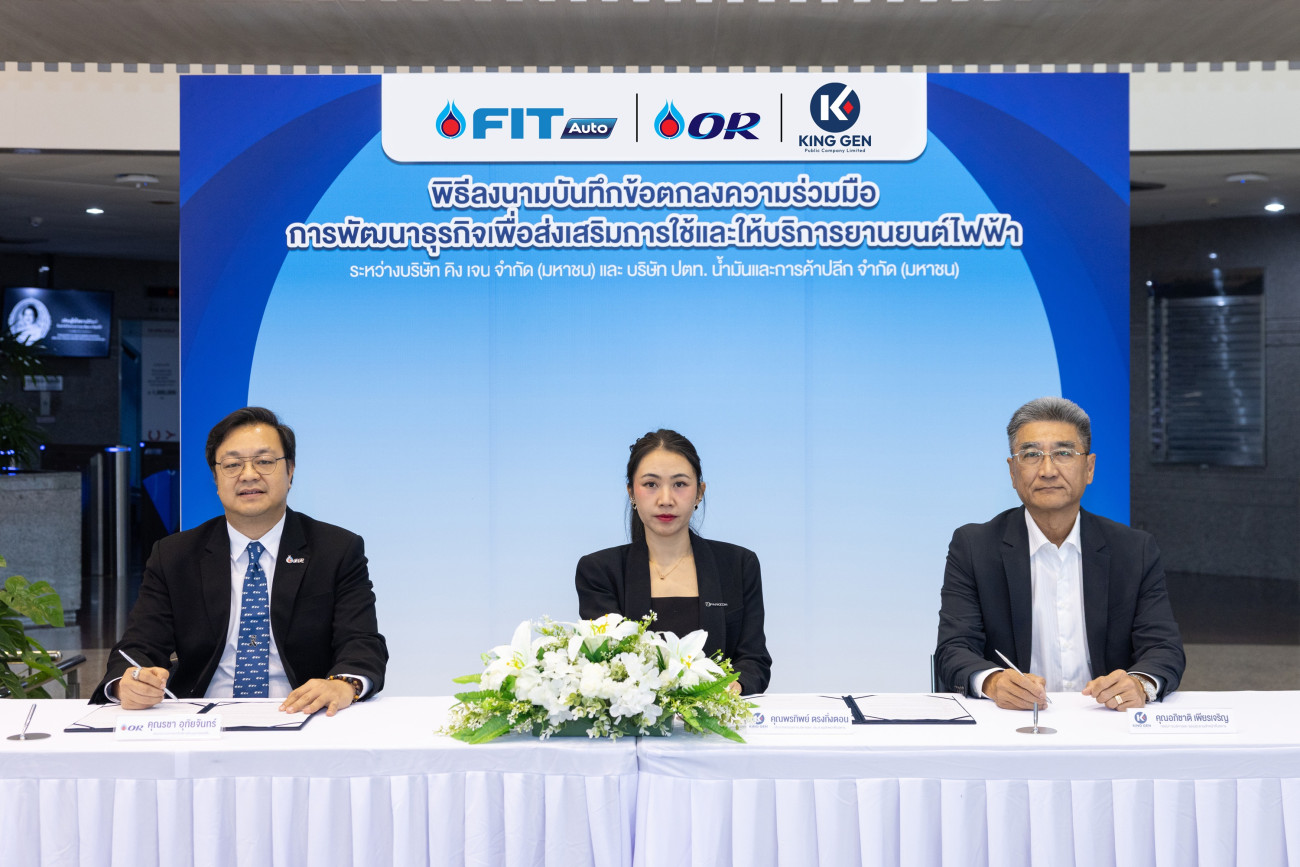 คุณรชา อุทัยจันทร์ รองประธานเจ้าหน้าที่บริหารด้านธุรกิจหล่อลื่น บริษัท ปตท. น้ำมันและการค้าปลีก จำกัด (มหาชน)(OR) พร้อมด้วย คุณพรทิพย์ ตรงกิ่งตอน ประธานกรรมการบริหารและประธานเจ้าหน้าที่บริหาร และ คุณอภิชาติ เพียรเจริญ กรรมการบริหารและรองประธานเจ้าหน้าที่บริหาร บริษัท คิง เจน จำกัด (มหาชน) ลงนามในบันทึกข้อตกลงความร่วมมือทางธุรกิจ (MOU) ระหว่าง ศูนย์บริการยานยนต์ FIT Auto และ KING GEN เพื่อพัฒนาและส่งเสริมการใช้ รวมถึงการให้บริการยานยนต์ไฟฟ้า (EV) อย่างครบวงจร โดยจะร่วมกันศึกษาและพัฒนาธุรกิจด้านการตรวจสอบและซ่อมบำรุงยานยนต์ไฟฟ้า (EV After-Sales Service Point) เพื่อยกระดับมาตรฐานการให้บริการ สร้างความเชื่อมั่นให้ลูกค้า และวางรากฐานสู่การขยายเครือข่ายบริการยานยนต์ไฟฟ้าในอนาคต