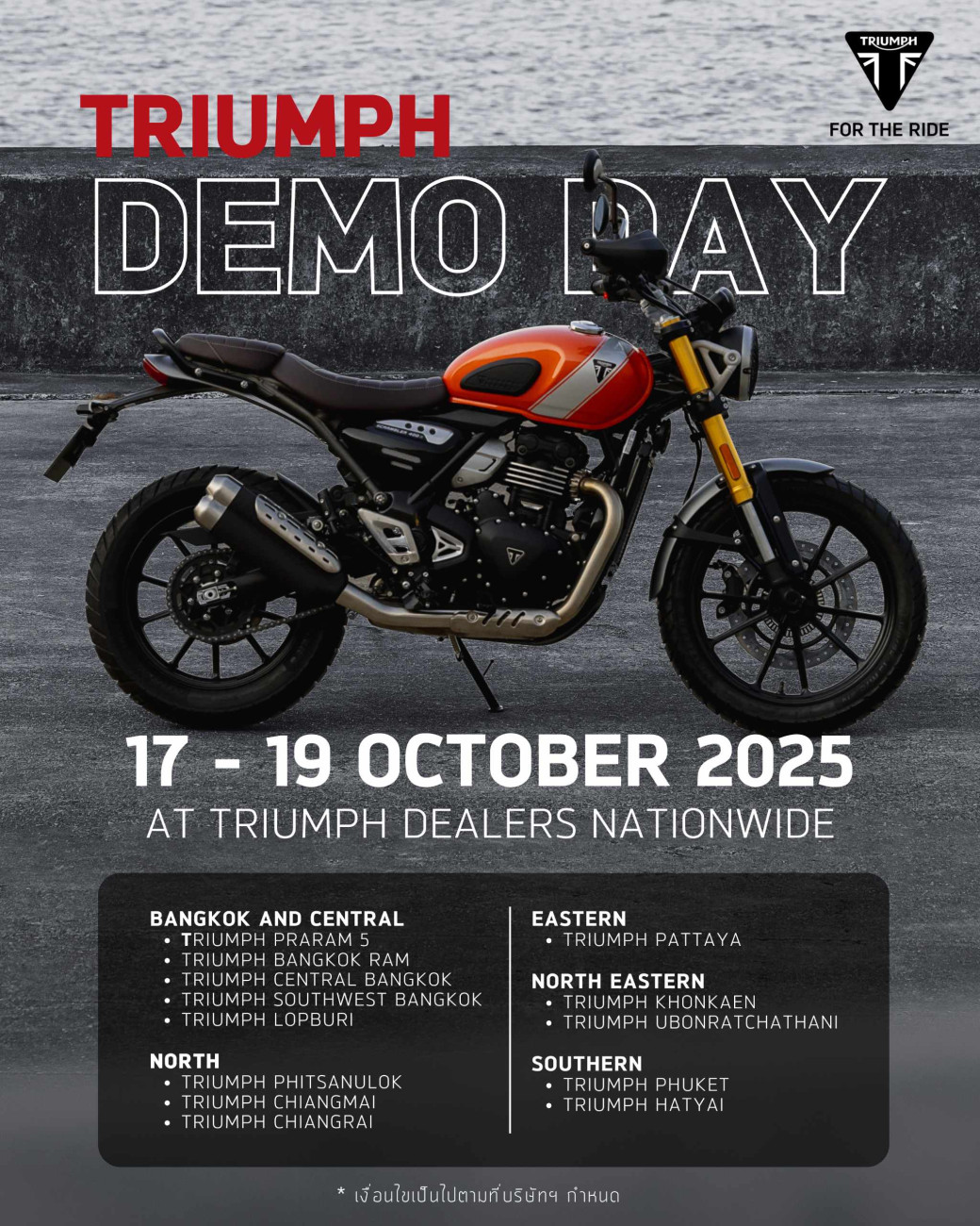 3 วันเท่านั้น!! ไทรอัมพ์ ชวนไรเดอร์ร่วมสัมผัสประสบการณ์ขับขี่รถที่ใช่ ในกิจกรรม Triumph Demo Day 2025 พร้อมรับโปรฯ สุดพิเศษ ระหว่างวันที่ 17 – 19