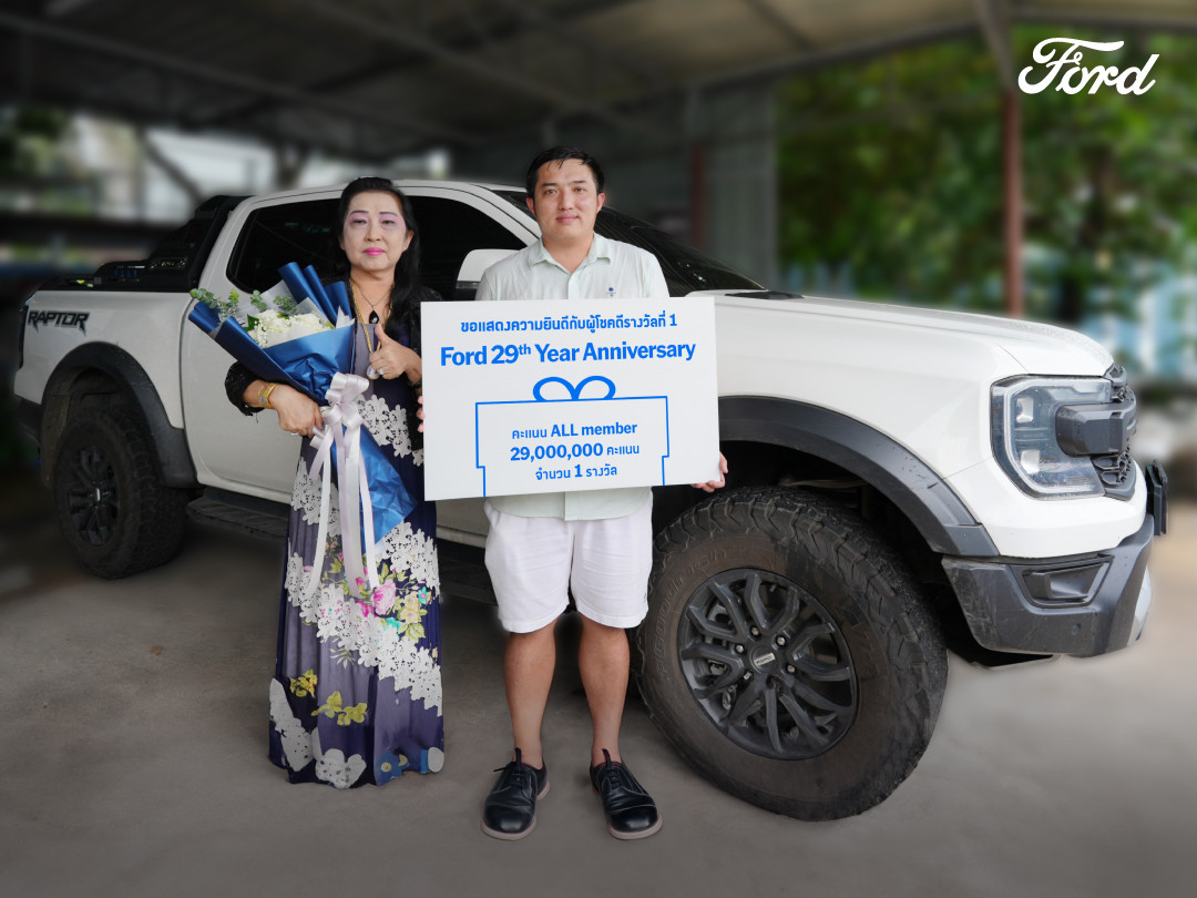ฟอร์ด ประเทศไทย มอบรางวัลแก่ผู้โชคดีที่ได้รับรางวัลที่ 1 จากแคมเปญฉลองครบรอบ 29 ปี รับคะแนน ALL Member 29 ล้านคะแนน ได้แก่ คุณสุขใจ สุดดี ลูกค้าที่ซื้อรถฟอร์ด เรนเจอร์ แร็พเตอร์ เครื่องยนต์ 2.0 ลิตร