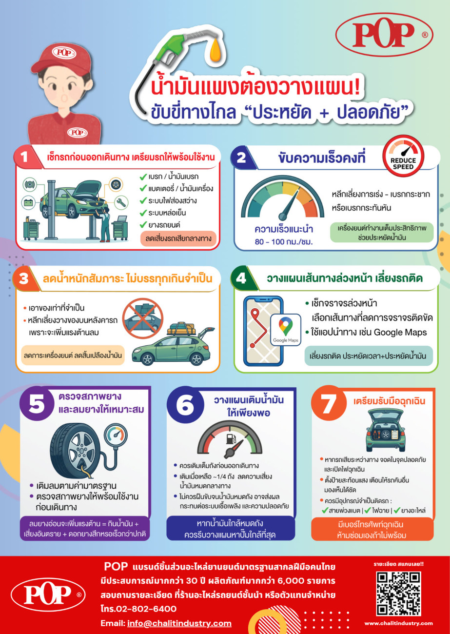 ข้อมูลจาก นายชวิศ ยงเห็นเจริญ กรรมการผู้จัดการ บริษัท ชลิต อินดัสทรี จำกัด ผู้ผลิตและจัดจำหน่ายชิ้นส่วนอะไหล่ยานยนต์มาตรฐานสากลฝีมือคนไทย ภายใต้แบรนด์ “POP” ซึ่งอยู่ในอุตสาหกรรมยานยนต์ไทยมากกว่า 30 ปี เปิดเผยว่า ปัญหาที่มักพบในช่วงเดินทางเทศกาลสงกรานต์คือ สภาพการจราจรติดขัดต่อเนื่อง ส่งผลให้เครื่องยนต์ทำงานหนัก เกิดความร้อนสะสมสูง ขณะเดียวกันผู้ขับขี่ก็มีโอกาสเกิดความเหนื่อยล้า ซึ่งล้วนเป็นปัจจัยเสี่ยงด้านความปลอดภัยโดยตรง