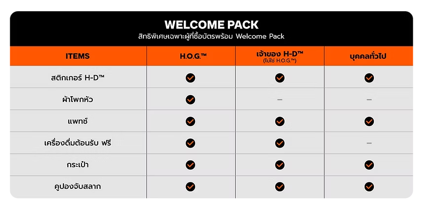 ริสแบนด์, สิทธิ์โหวต Custom King, บัตรเล่นเกม, แพทซ์, สติกเกอร์ H-D, ผ้าโพกหัว, Welcome Drink,กระเป๋า, คูปองจับสลาก,และกิจกรรมที่น่าสนใจอื่นๆ |