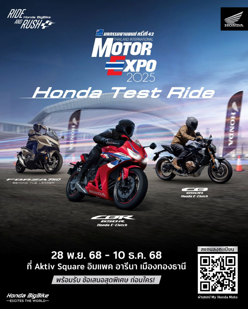 ฮอนด้าบิ๊กไบค์ เชิญชวนลูกค้ามาสัมผัสเทคโนโลยีจากฮอนด้า Honda E-Clutch และ Honda DCT ในกิจกรรม Honda BigBike Test Ride ที่ยกทัพรถจักรยานยนต์ฮอนด้าบิ๊กไบค์ทุกรุ่น มาให้ลูกค้าได้ทดลองขี่กันอย่างเร้าใจ รวมถึงรถจักรยานยนต์ฮอนด้ารุ่นใหม่ รวมถึงรุ่นไฮไลต์ในคลาส 750series ไม่ว่าจะเป็น New Honda X-ADV และ New Honda FORZA750 สำหรับกิจกรรมในครั้งนี้เปิดให้ร่วมทดสอบ ฟรี! ตั้งแต่ 28 พฤศจิกายน – 10 ธันวาคม 2568 ในงานมหกรรมยานยนต์ครั้งที่ 42 (Motor Expo 2025) ณ ลาน Aktiv Square อิมแพค อารีนา เมืองทองธานี