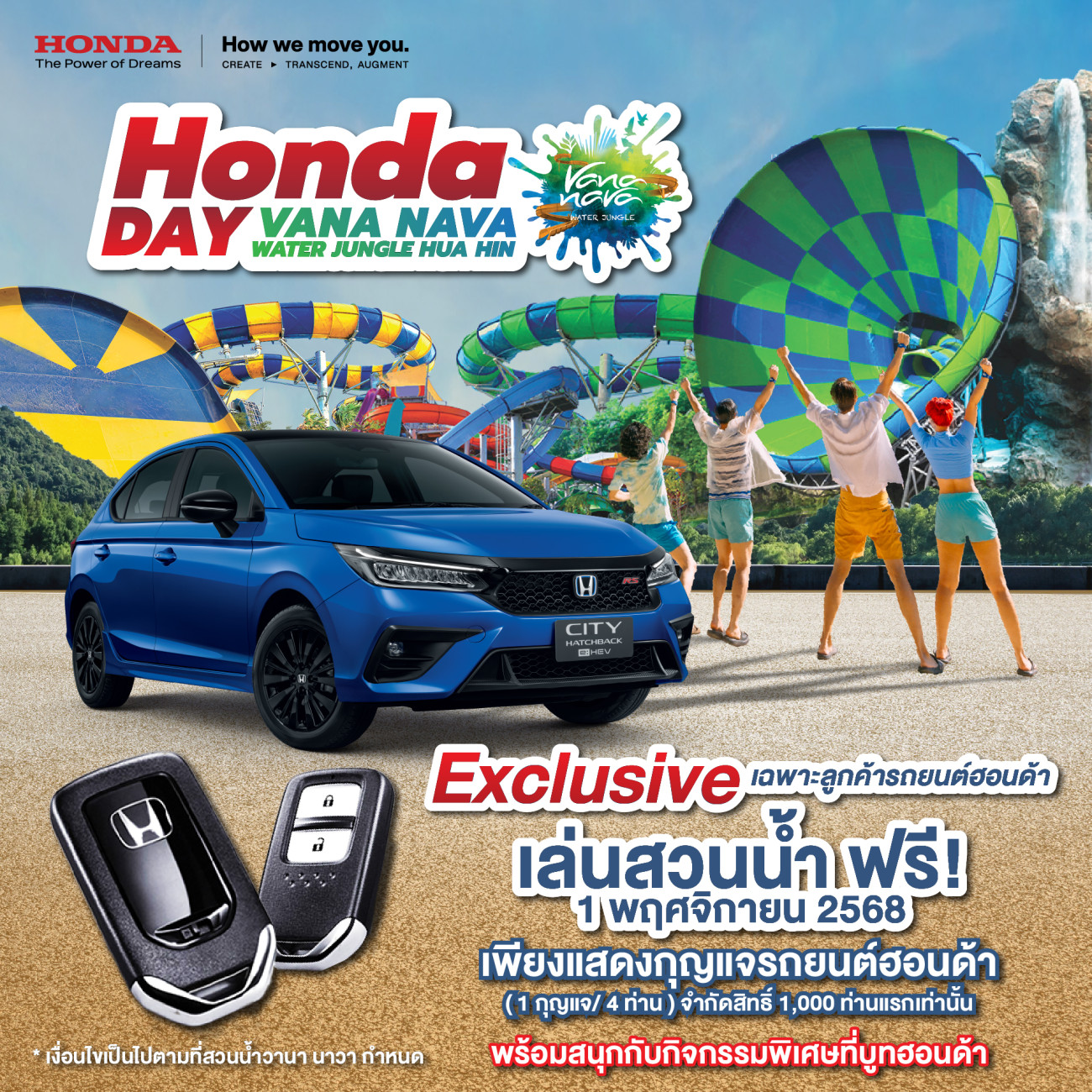 ครอบครัวฮอนด้า เตรียมตัวให้พร้อม! กับกิจกรรม Honda Day 2025 มอบสิทธิพิเศษ เข้าสวนน้ำ วานา นาวา หัวหิน (Vana Nava Hua Hin) ฟรี ! ในวันเสาร์ที่ 1 พฤศจิกายน 2568 เพียงโชว์กุญแจรถยนต์ฮอนด้ารุ่นใดก็ได้ ที่จุดจำหน่ายบัตรหน้าสวนน้ำ 1 กุญแจ สนุกได้ทั้งครอบครัวสูงสุด 4 ท่าน พร้อมรับฟรี ! คูปองแลกของที่ระลึก และสนุกกับกิจกรรมสุดพิเศษอีกมากมายที่บูทฮอนด้าในงาน จำกัดสิทธิ์เพียง 250 สิทธิ์ หรือ 1,000 ท่าน เท่านั้น !