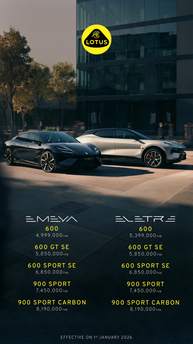 โลตัส คาร์ ประเทศไทย ผู้นำเข้าและตัวแทนจำหน่ายรถยนต์โลตัสอย่างเป็นทางการแต่เพียงผู้เดียวในประเทศไทย ประกาศราคาใหม่ตามอัตราภาษี 2569 ตามการบังคับใช้ภาษีสรรพสามิตในอัตราใหม่ ส่งผลให้โลตัส คาร์ ประเทศไทย มีความจำเป็นต้องปรับราคาจำหน่ายรถยนต์ตามนโยบายของภาครัฐ ทางทีมผู้บริหารของโลตัส คาร์ ประเทศไทย ได้เล็งเห็นถึงสภาพตลาดรถยนต์ไฟฟ้าปัจจุบัน ที่มีการแข่งขันกันอย่างมาก และให้ความสำคัญต่อการปรับราคารถยนต์ตามอัตราภาษีใหม่ในครั้งนี้ ทางทีมผู้บริหารจึงต้องการให้ราคาใหม่ มีความเหมาะสมและสอดคล้องกับบริบทของตลาดรถยนต์ไฟฟ้าและส่งผลกระทบในมุมกว้างอย่างน้อยที่สุด โดยเฉลี่ยปรับราคาขึ้นเพียง 109,000-200,000 บาทเท่านั้น ขึ้นอยู่กับแต่ละรุ่นย่อย อย่างรุ่นเริ่มต้น Emeya 600 ราคาเริ่มที่ 4.999 ล้านบาท และรุ่นเริ่มต้น Eletre 600 ราคาเริ่มที่ 5.399 ล้านบาท ซึ่งยังเป็นราคาที่พร้อมรองรับกับความต้องการของตลาดกลุ่มรถยนต์ไฟฟ้าสมรรถนะสูง เพื่อให้ลูกค้ายังสามารถเข้าถึง โลตัส คาร์ ได้อย่างกว้างขวาง และยังคงตอบโจทย์การใช้งาน สะท้อนไลฟ์สไตล์การขับขี่ที่แตกต่าง เหมาะสำหรับลูกค้าที่มองหาความเป็นเอกลักษณ์ ไม่เหมือนใครบนท้องถนน
