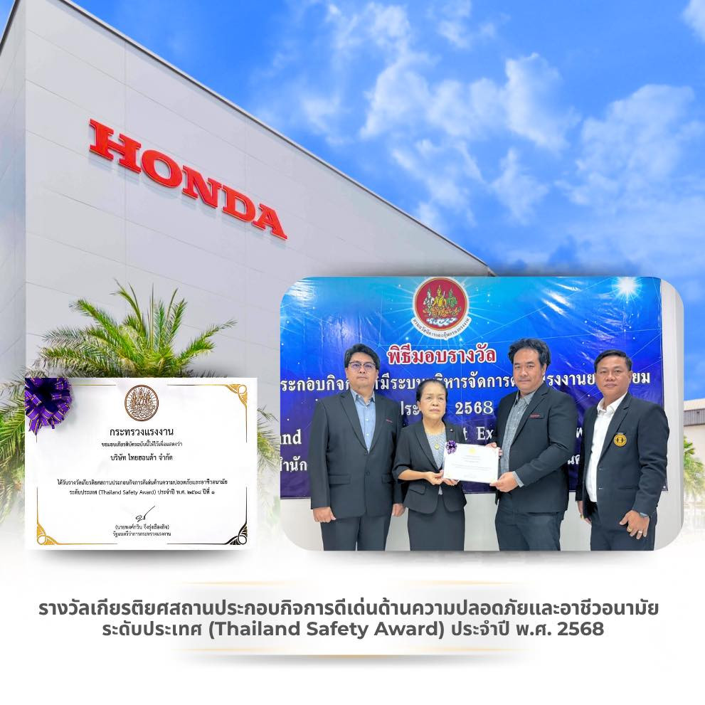 บริษัท ไทยฮอนด้า จำกัด คว้าสองรางวัลเกียรติยศระดับประเทศ โดยได้รับ “รางวัลเกียรติบัตรสถานประกอบกิจการดีเด่นด้านความปลอดภัยและอาชีวอนามัย ระดับประเทศ (Thailand Safety Award) ประจำปี 2568” อันเป็นผลจากการดำเนินงานอย่างต่อเนื่องด้านมาตรฐานความปลอดภัยในสถานประกอบการ อีกทั้งยังได้รับ “รางวัลสถานประกอบกิจการดีเด่นด้านแรงงานสัมพันธ์และสวัสดิการแรงงาน ประจำปี 2568” ตอกย้ำมาตรฐานความปลอดภัยและแรงงานสัมพันธ์ที่ยั่งยืน